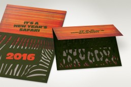 It’s a journey of discovery at Lady Luck Casino Blackhawk. This invitation for the casino’s safari themed New Year’s Eve party features a customized envelope, a die cut inner sleeve, and a die cut roll-fold invite. Traditional geometric patterns and animal prints inspired the creative for this adventurous invitation.
